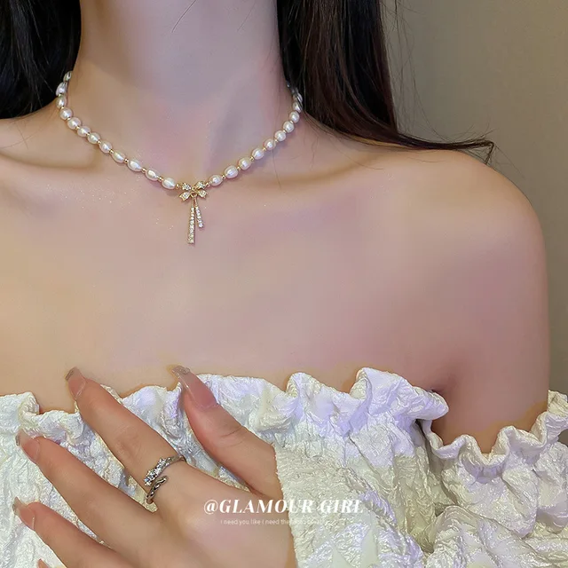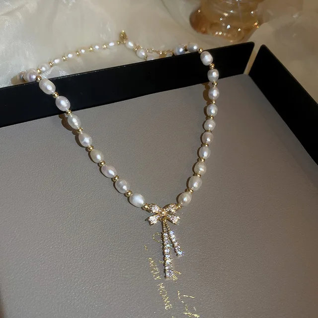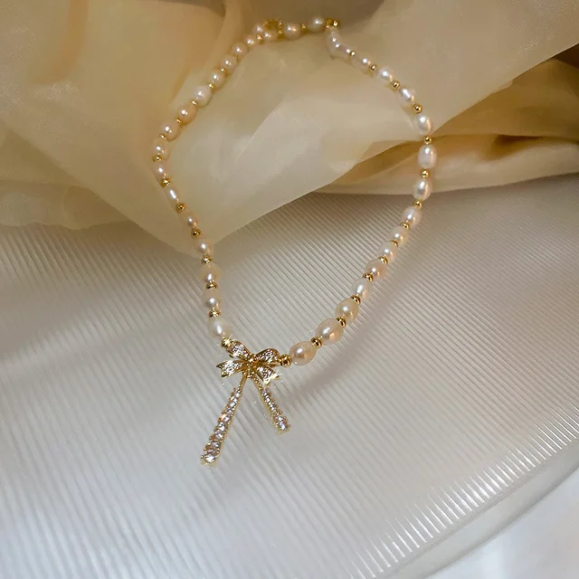 100% Natural Freshwater Pearl 14K Gold Filled Trendy Shiny CZ Zircon Bowknot Female Necklace Jewelry For Women Chains Gifts