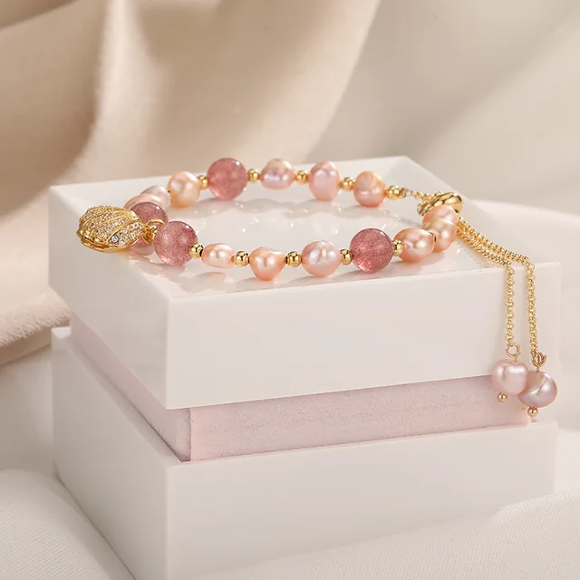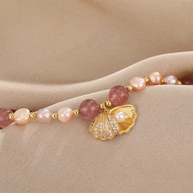 100% Pink Freshwater Pearl & Strawberry Quartz Trendy Shell Design 14K Gold Filled Female Charm Bracelets For Women Gifts