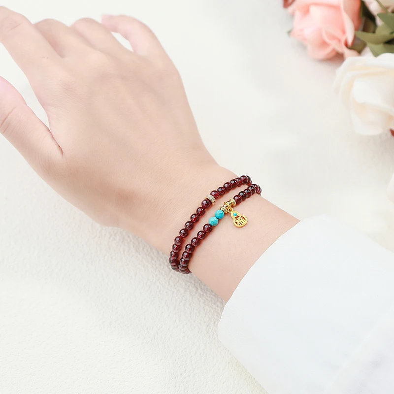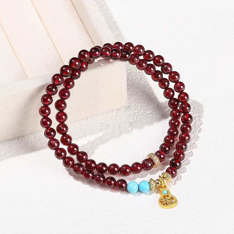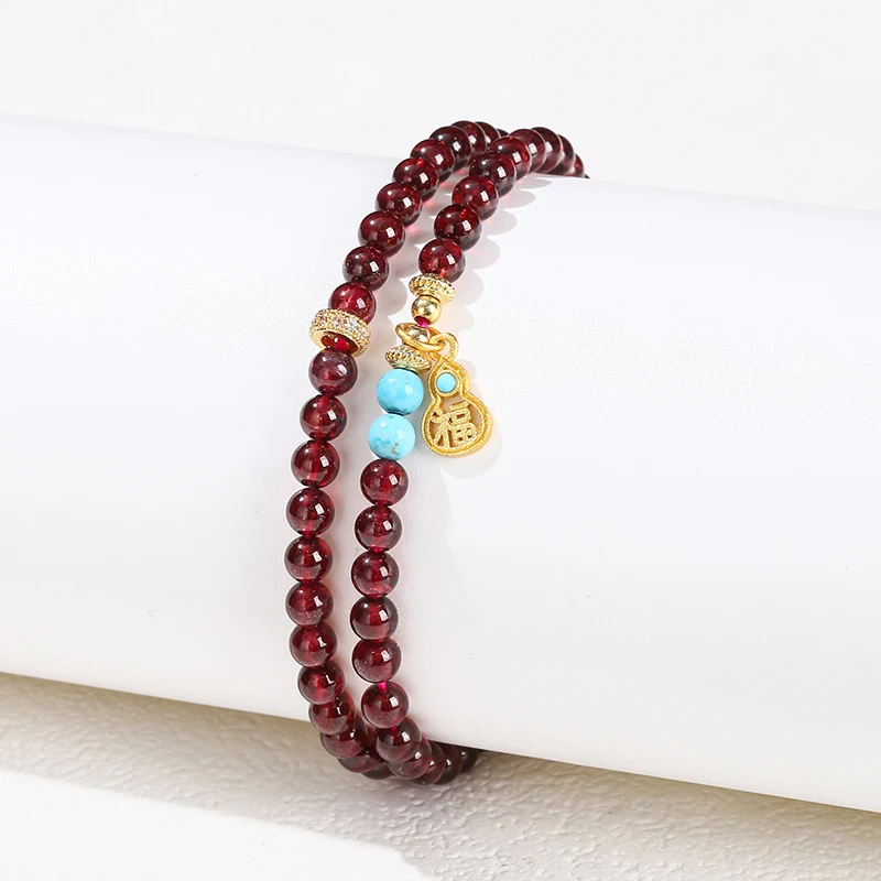 4mm Natural Garnet Stone Copper Gourd Pendant 2-Layer Strand Bracelets Women Elegant Design Healing Energy Jewelry For Female