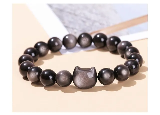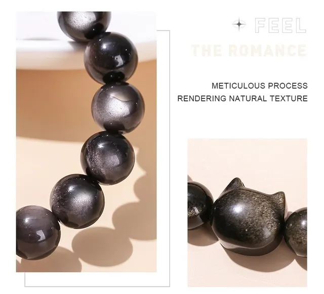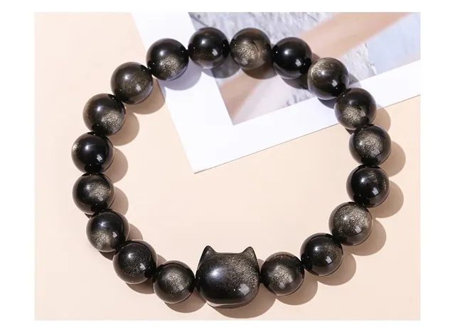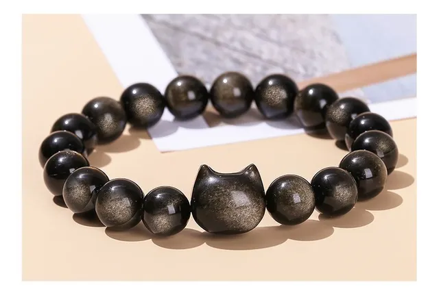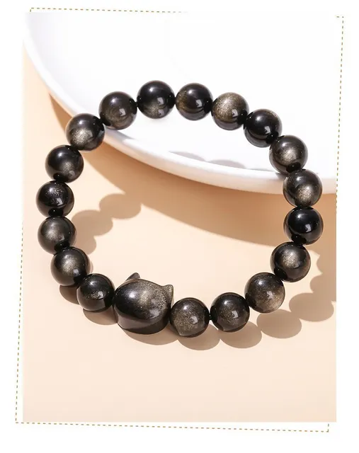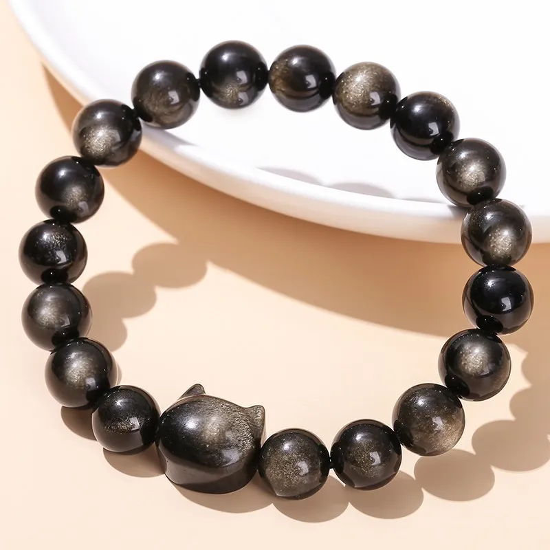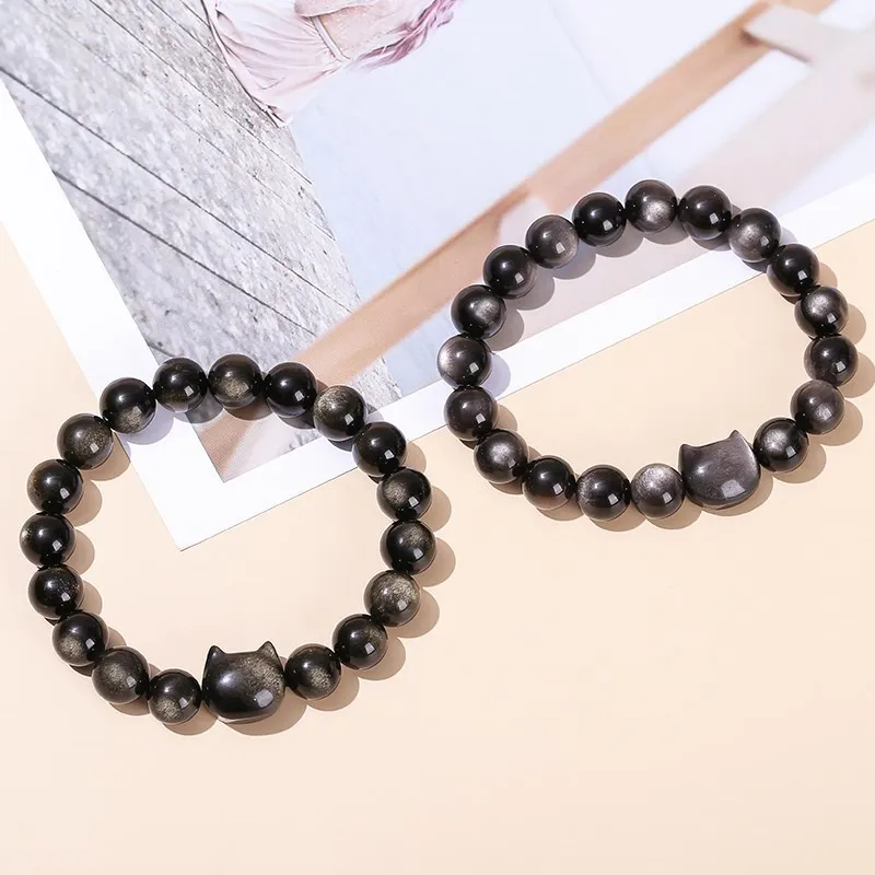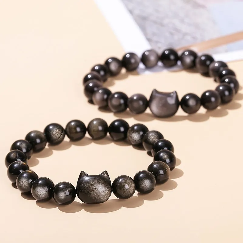 7A Natural Gold Silver Color Shiny Black Obsidian Bead Cat Head Strand Bracelets Women Men Charm Round Bead Energy Bracelet