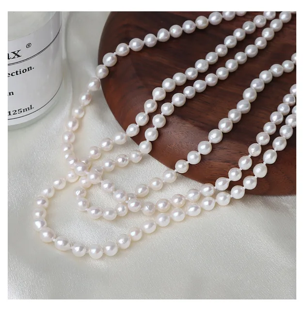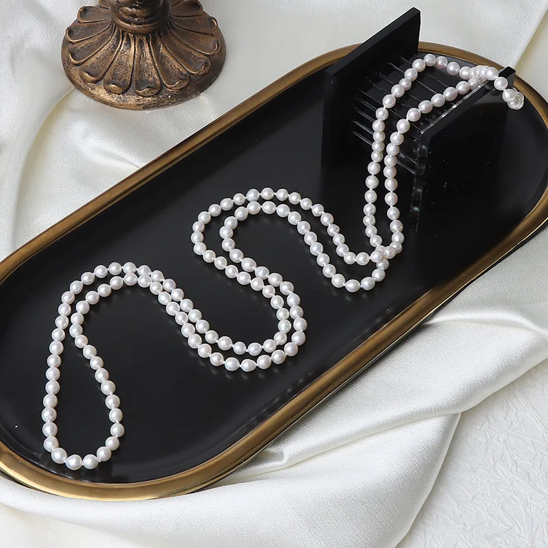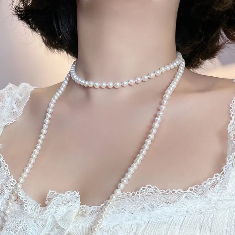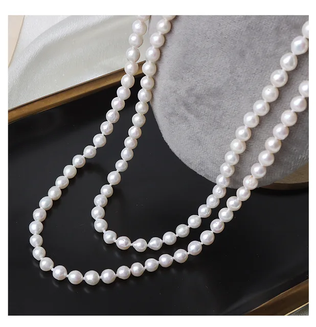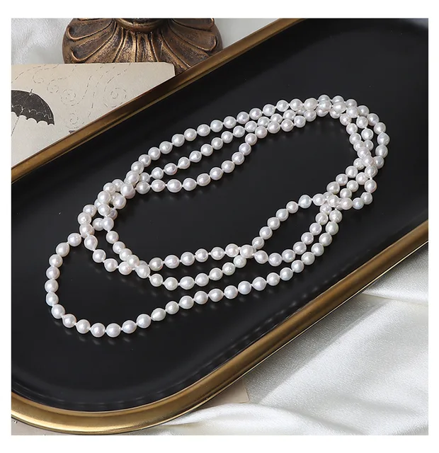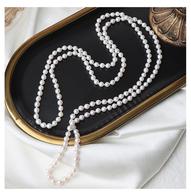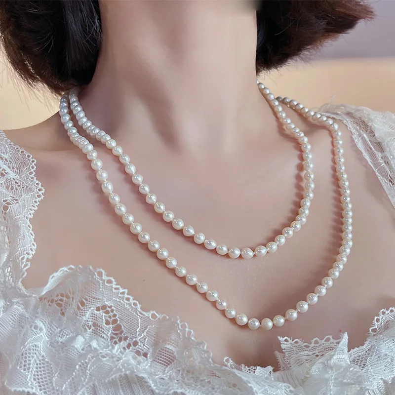 French Retro 5-6mm Natural Freshwater Pearl Sweater Chain 120cm Long Necklace Double Layer Each Knot