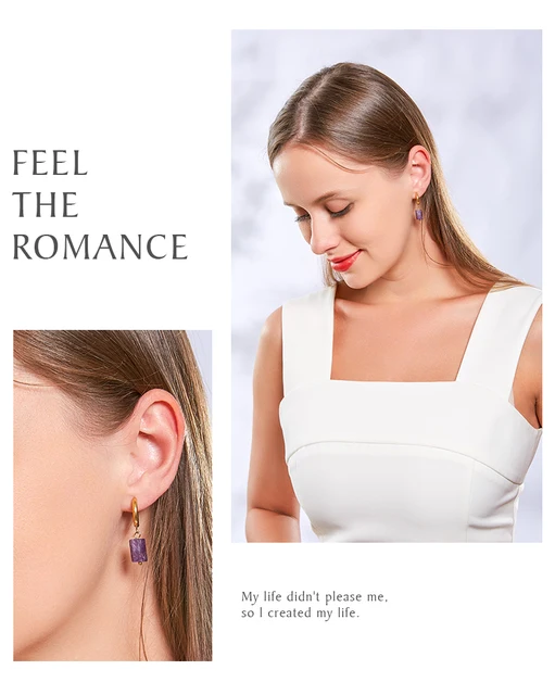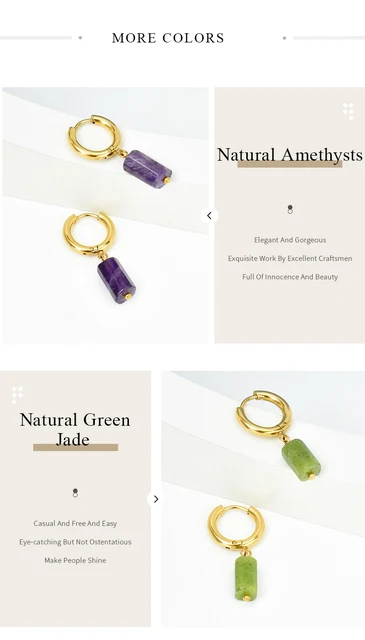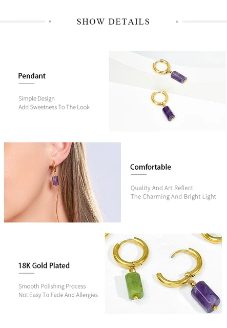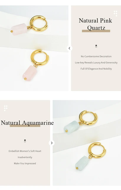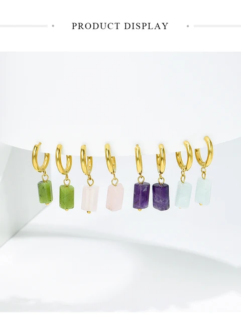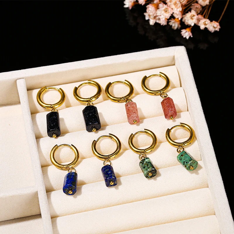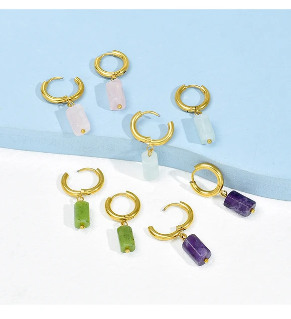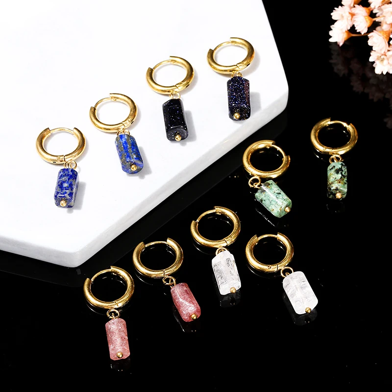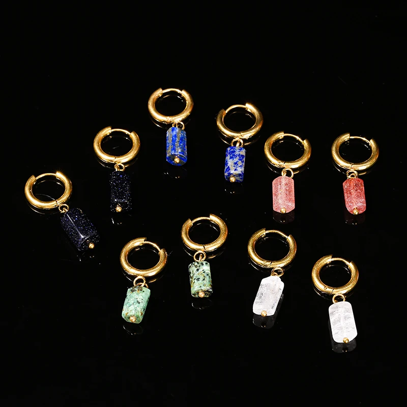 Natural Stone Amethyst Aquamarine Cylindrical Pendant Stainless Steel Round Buckle Earrings Women Energy Healing Ear Jewelry