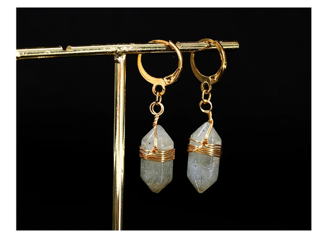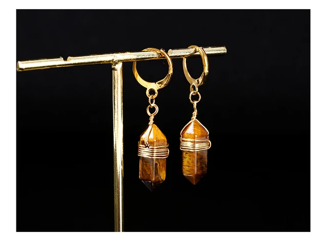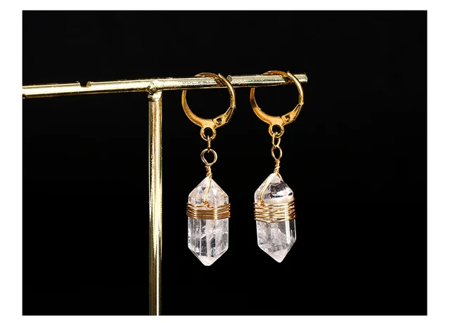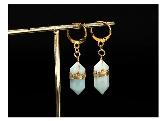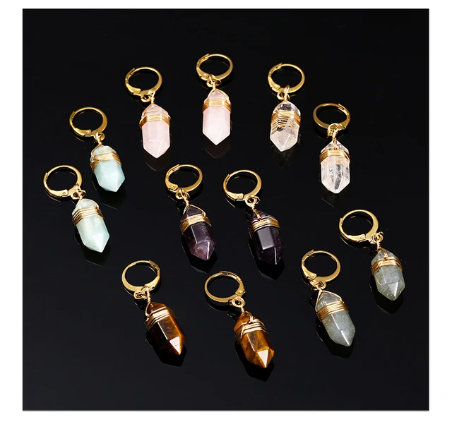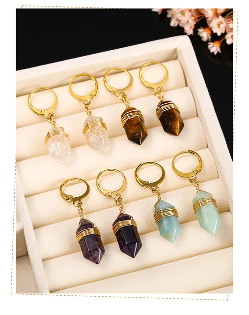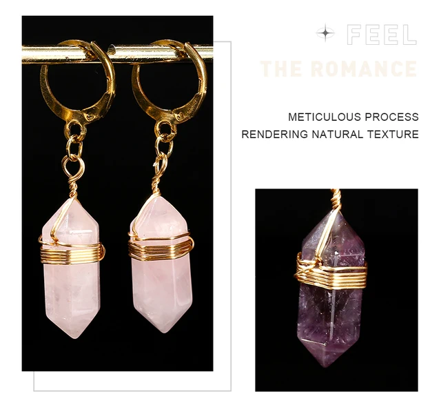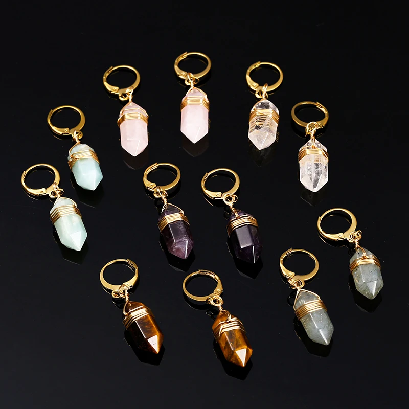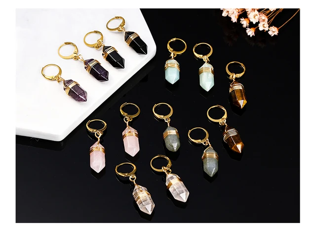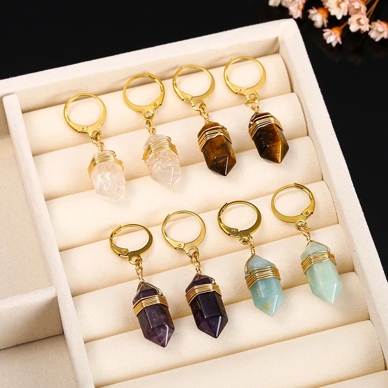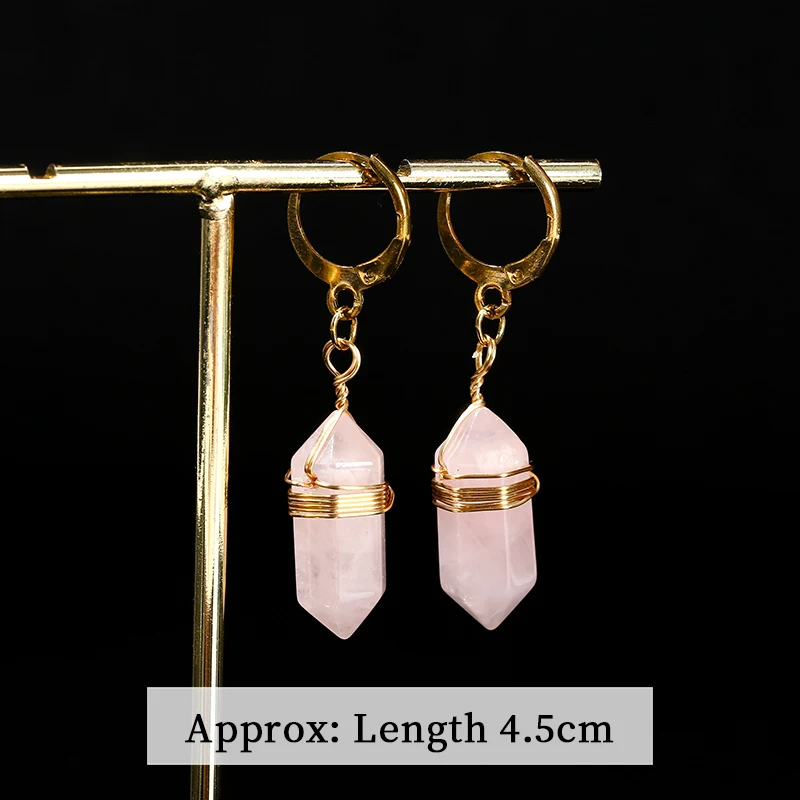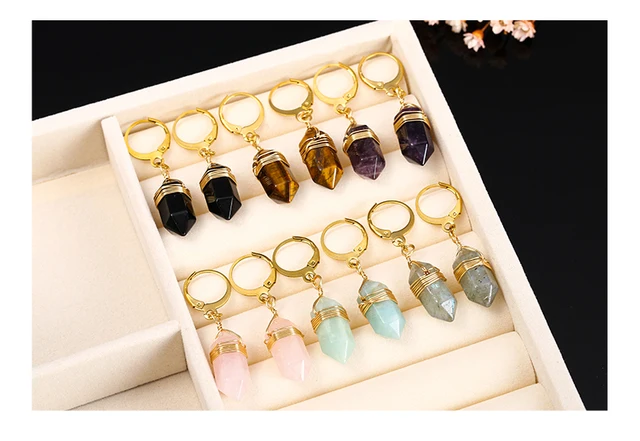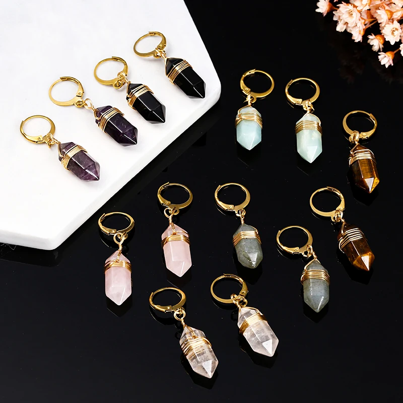 Natural Stone Amethyst Pink Quartz Black Obsidian Hexagonal Cylindrical Earrings Women Mineral Handmade Charm Dangle Earrings