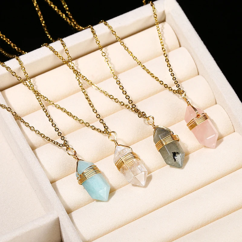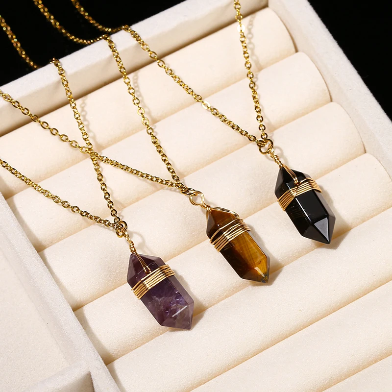 Natural Stone Amethyst Yellow Tiger Eye Obsidian Hexagon Column Charm Necklace Women Men Fashion Energy Healing Chain Choker