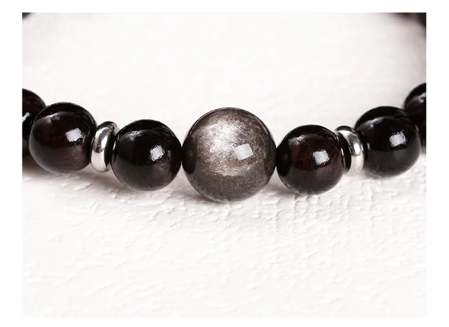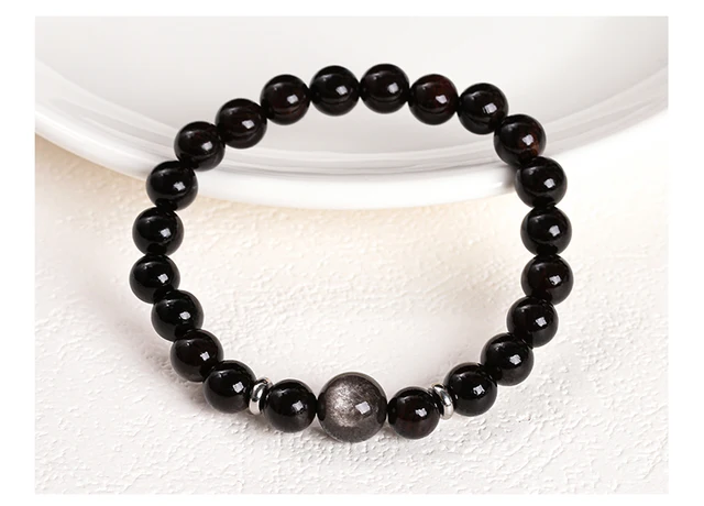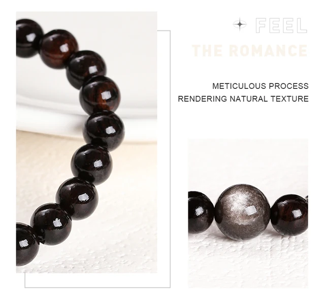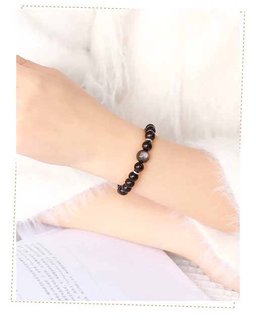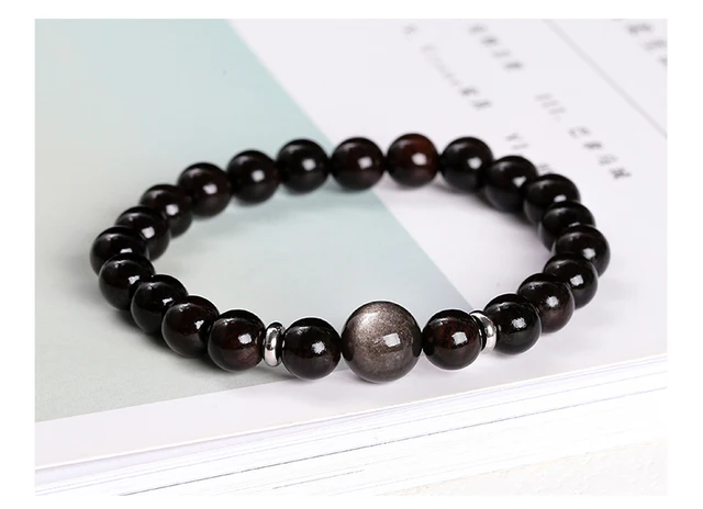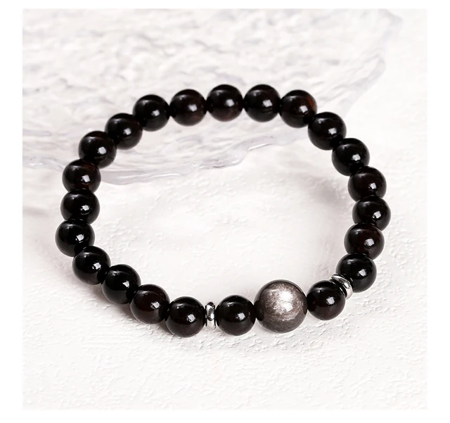 Natural Stone Black Sandalwood Silver Color Irisation Obsidian Bead Bracelets Women Men Simple Lucky Stretch Jewelry Gift