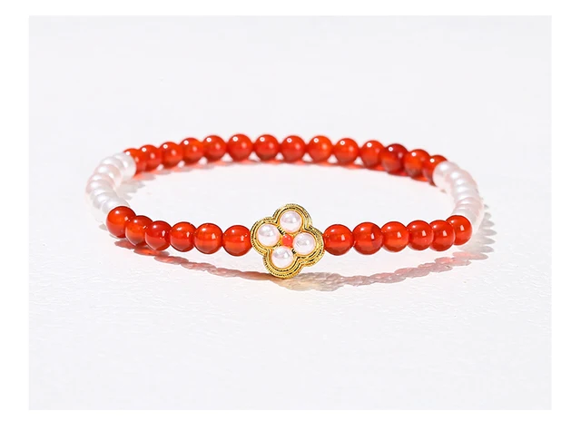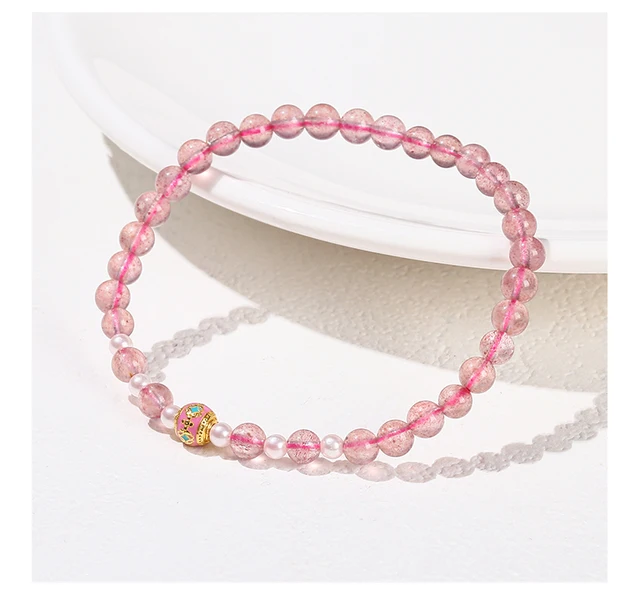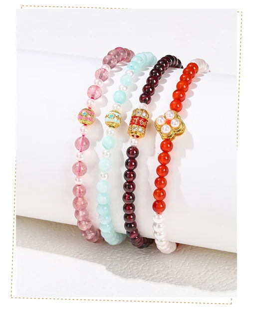 Natural Stone Small Bead Copper Flower Design Bracelet Women Luxury Elegant Garnet Strawberry Quartz Stretch Healing Jewelry