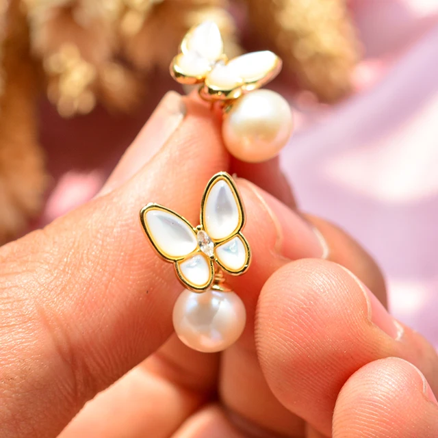 New Style Sweet Butterfly 100% Natural Freshwater Pearl 14K Gold Filled Ladies Tassels Stud Earrings Jewelry For Women Gift